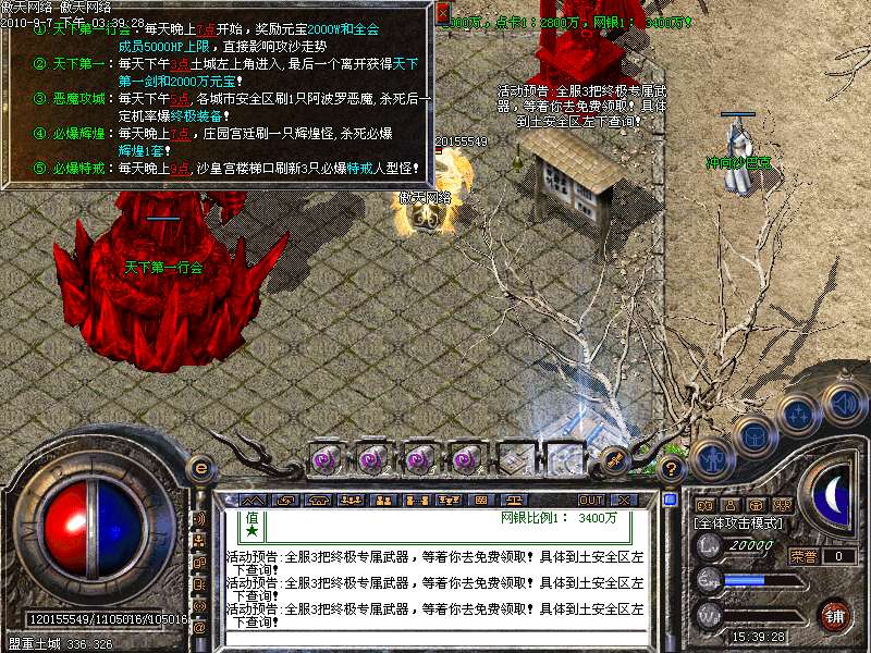 天下第一行会(本服特色):每天下午7点,土城正中进入,最后一个离开的行会获得天下第一行会封号和2000万元宝和全员HP上限加5000的超级待遇,拿沙前的激情热身活动,道士法师也并非无用武之地