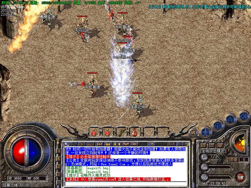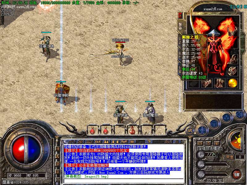 服务器将于开区后第3天进行统一攻沙(如:1号开区拿沙时间为3号),第一任沙城主将获得30000个元宝!!