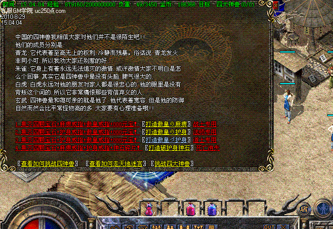 【铁血雄狮任务】服务器的四大神兽任务,只要集齐四个神石即可兑换一头超强大华丽的铁血雄狮座骑,骑上之后游戏速度快人一倍!