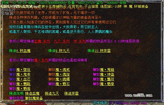 为了让玩家玩的更加**.服务器整体修改怪物爆率.数量.刷新时间! 地图贵族20分钟一刷!BOSS.领主.30分钟一刷。让你体验打装备的乐趣!服务器所有装备全部有爆率!