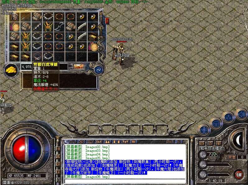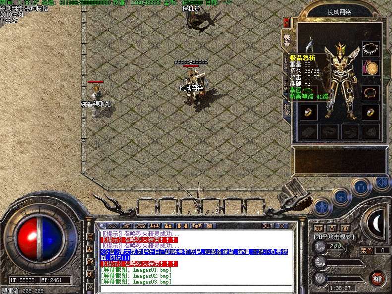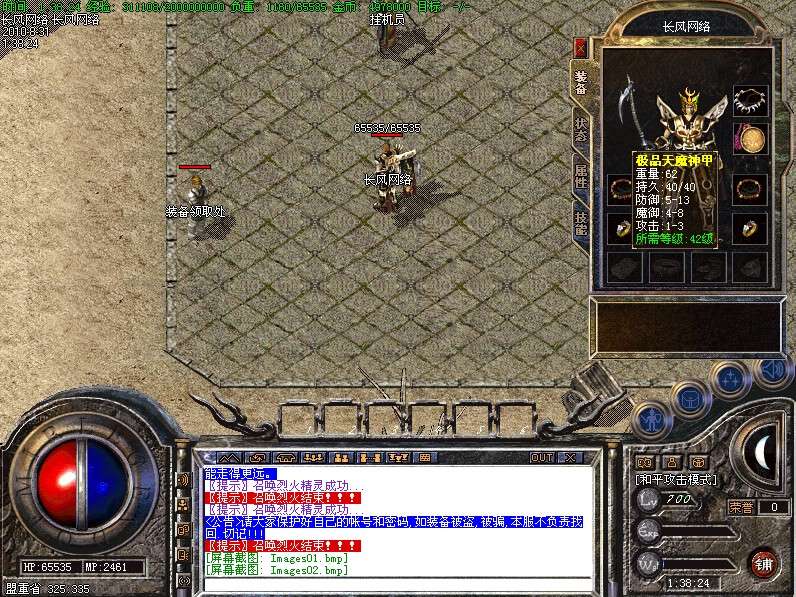 三.【特色活动】封魔谷皇宫内(17,22)与土城药店(356,336)每4小时刷一个终极BOSS〖守护神〗,此怪丧失人性,杀人不眨眼,极其凶险,望各位玩家注意!不过爆率绝对OK!!!