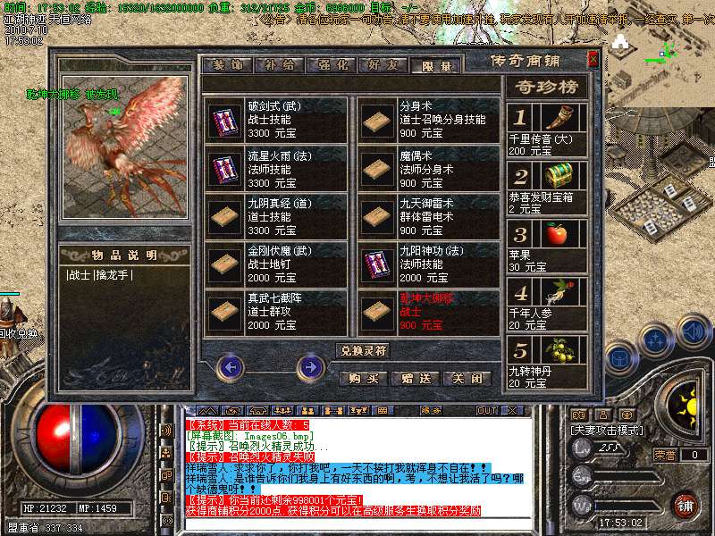 [天下第一]:三职业可在土城申请天下第一.申请后在商铺购买物品是普通玩家的8折!!!