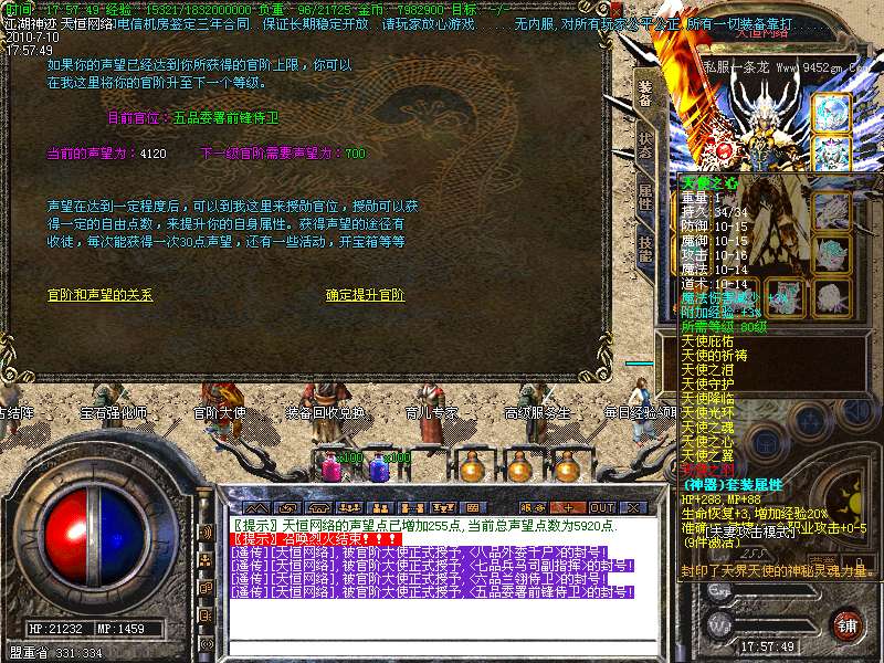[官阶系统]:玩家可以用声望进行官阶提升.提升后将有属性增加等多功能封号系统!!!