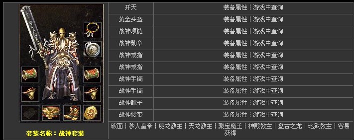 战神装备:各大地图BOSS(破面,秒人皇帝,神殿教主,地狱教主,天龙教主,魔龙教主等)终极武器:各大BOSS,天龙第八层必爆星王之刃