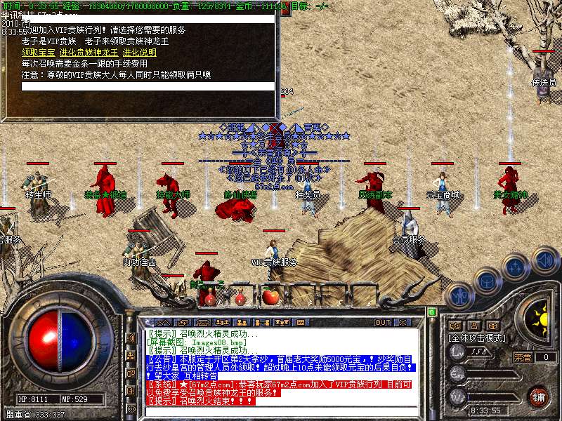 本服新推出 召唤★至尊神龙王★宝宝服务!如果你闲自己本身终极套还不够厉害的话!您可以去土城的VIP贵族NPC处申请VIP贵族!成功加入后可以享受召唤俩只攻击超强而且攻击同时还带麻痹属性的宝宝与你作战!
