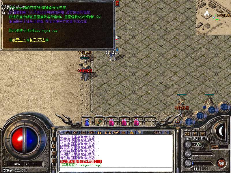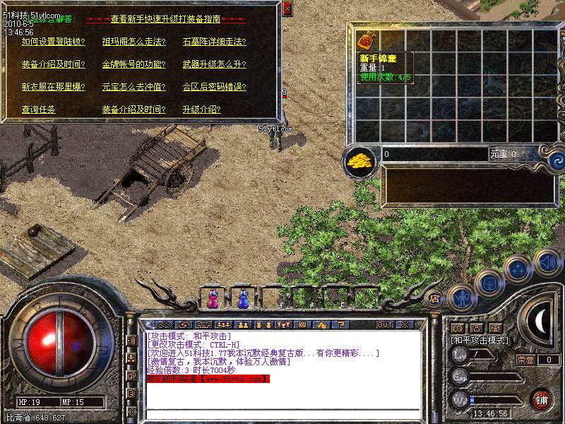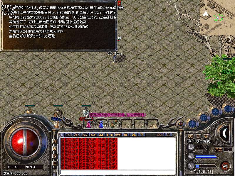 (*)重不归路可以进入僻世森林,神奇之地可以进入绝望和地下魔宫都是出46级以上装备的地方,土右上的西方游客可以进入麒麟洞和地狱之牢可以打出49以上装备。
