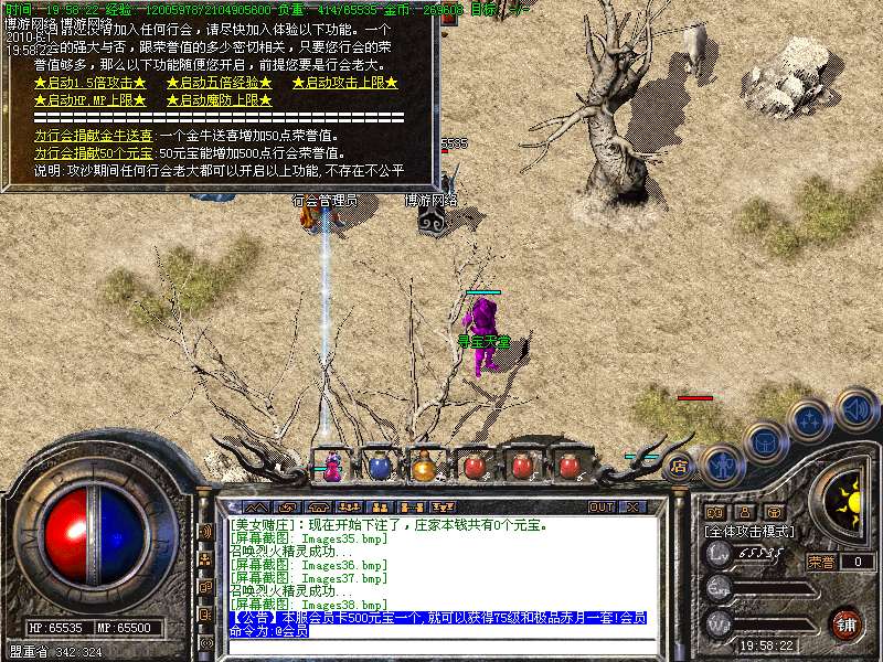 【攻城奖励】开区第2天开始沙战,第一任沙老大奖励10000元宝!合区后老区一天攻一次城,沙老大可以领取沙城主专用武器一把,攻击180,魔法150,道术150!