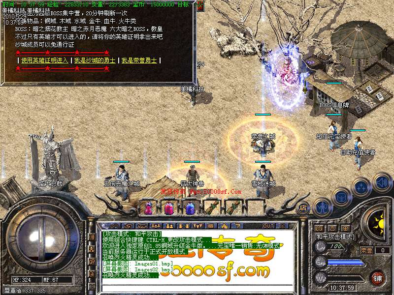 二.【地图介绍】:增加荣誉之都,刷新全服所有高级BOSS,刷新快,需要英雄证明进入,是兵家必挣之地,沙城员可以免费进入,英雄证明在六大暗之BOSS身上可以获得!