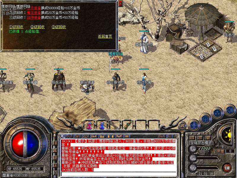 ★本区装备幸运以幸运+10套为最大的伤害力度!!幸运+3的项链很宝贵!所有装备在土老兵处可以同时兑换经验+金币!