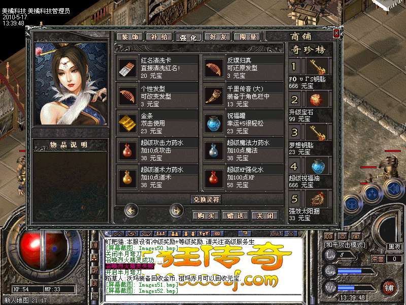 各位PK高手请注意新增的游戏热键: Alt+S 道士下毒模式(互换,绿毒,红毒) | CTRL+V 切换小地图 | CTRL+Z 显示物品名称 | TAB 快速复制人名 | Alt+G 快速组队 | Alt+R 刷新背包 | Alt+Q 快速退出游戏