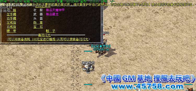 本服务器为正规仿盛大1.76版本,小极品狂爆,禁止穿人.穿怪.所有怪物刷新时间与盛大同步。对本服务器有任何不明白的地方,请打“@帮助”命令,了解服务器的综合问题!!金钻玩家请打“@服务”命令!!