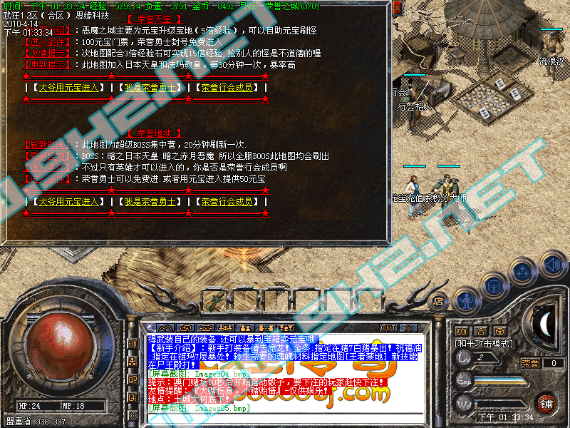 三.【地图介绍】:增加荣誉地狱,刷新全服所有高级BOSS,刷新快,需要元宝进入、荣誉行会争霸胜利行会跟荣誉勇士免费进入.此地为行会必争重地.刷新快