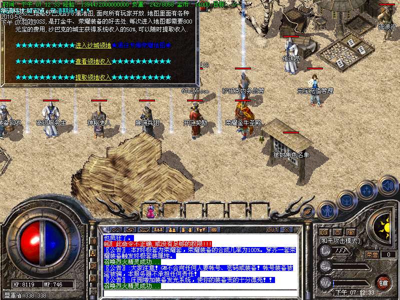 [254]新区在开放第三天,全体行会攻城,沙城主可以领取永恒权杖(沙奖)一把,另+88888元宝,并且可以随时领取沙领地收入,这里的元宝可是不少哟!