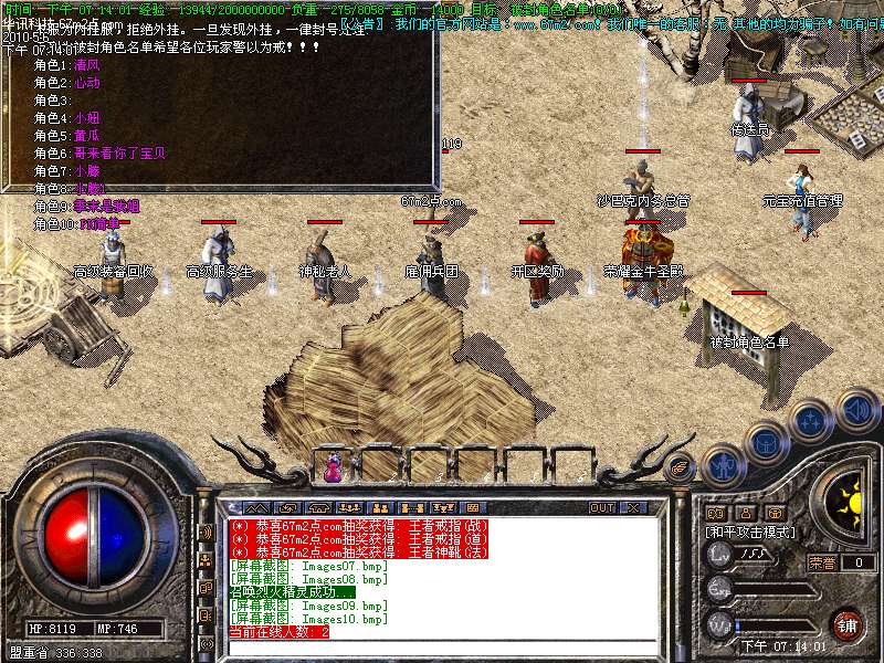 〖公告〗:非RMB得散人玩家注意了:你们可以去特殊地图打暗之怪物,可爆元宝,一般都是一个爆50,也会爆些逆火装备可以回收。有了300元宝就可以去雪域地图打逆火级和王者级装备,多的可以回收,在高级回收员那里,逆火5、王者20、金牛80并且有大量的经验哟。