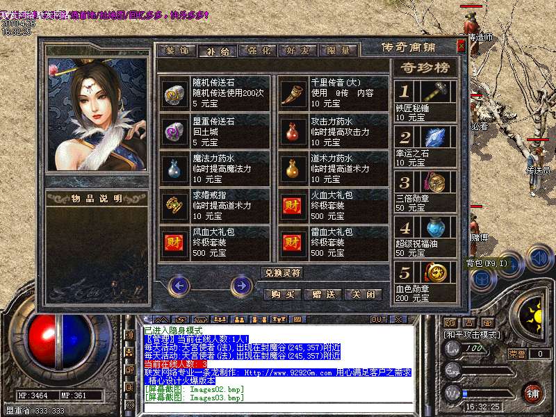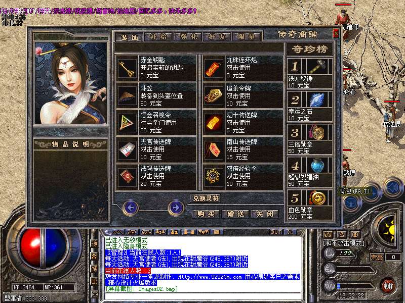 最新地图[法码神殿],里面刷服务器的所所有BOSS.暴率是外面的3倍,从桃园之门的神秘老人进入!