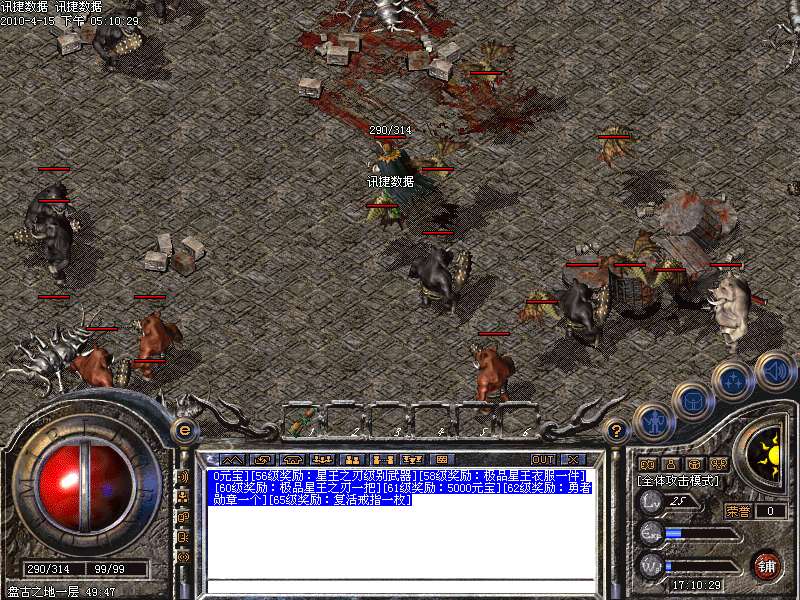 【冲级奖励】(系统自动送出,注意包裹空位)[48级奖励:20元宝] [50级奖励:屠龙系列装备][52级奖励:战神项链系列][54级奖励:200元宝][56级奖励:星王之刃级别武器][58级奖励:极品星王衣服一件][60级奖励:极品星王之刃一把][61级奖励:5000元宝][62级奖励:勇者勋章一个][65级奖励:复活戒指一枚]