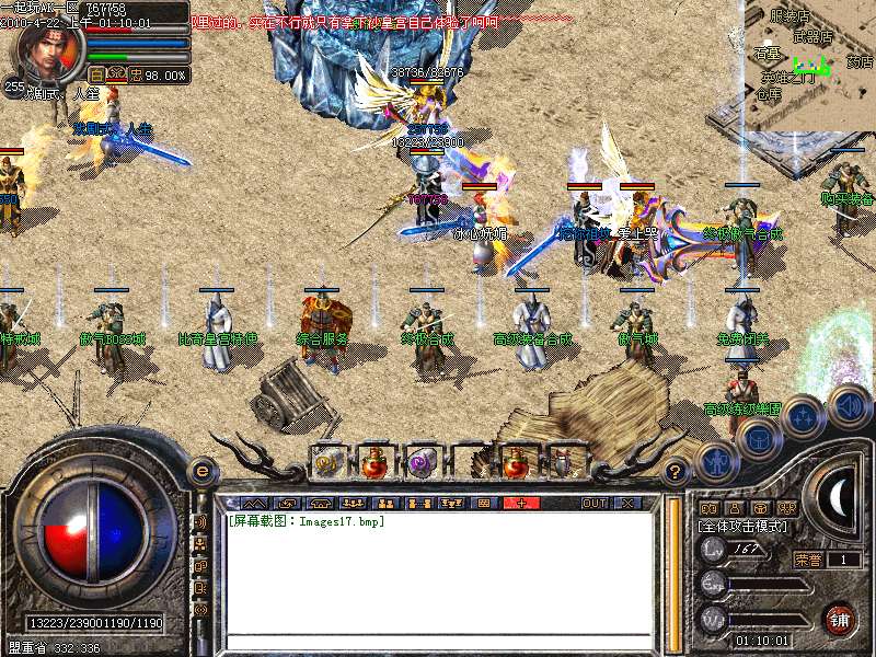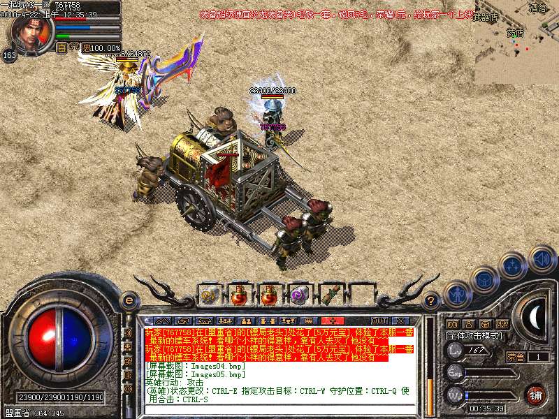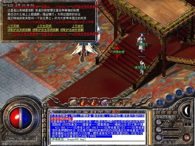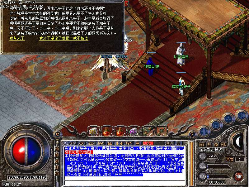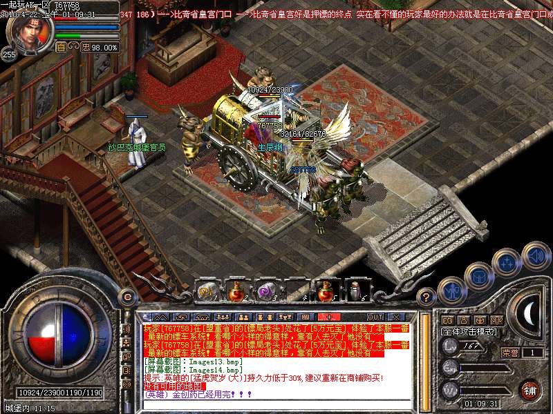 [255,56]本服最新加入押镖和送战奴系统:此提示为押镖行会必定经过的坐标和地图路线:沙巴克皇宫—->盟重省—->盟重通道—->毒蛇山谷(打工集中营 413 565 )—->比奇省(347 186)—->比奇省皇宫门口 —->比奇省皇宫好是押镖的终点 实在看不懂的玩家最好的办法就是在比奇省皇宫门口或者毒蛇山谷通道的入口处等,镖车是肯定只有从那里过的。实在不行就只有拿下沙皇宫自己体验了呵呵~~~~~~~~~~~