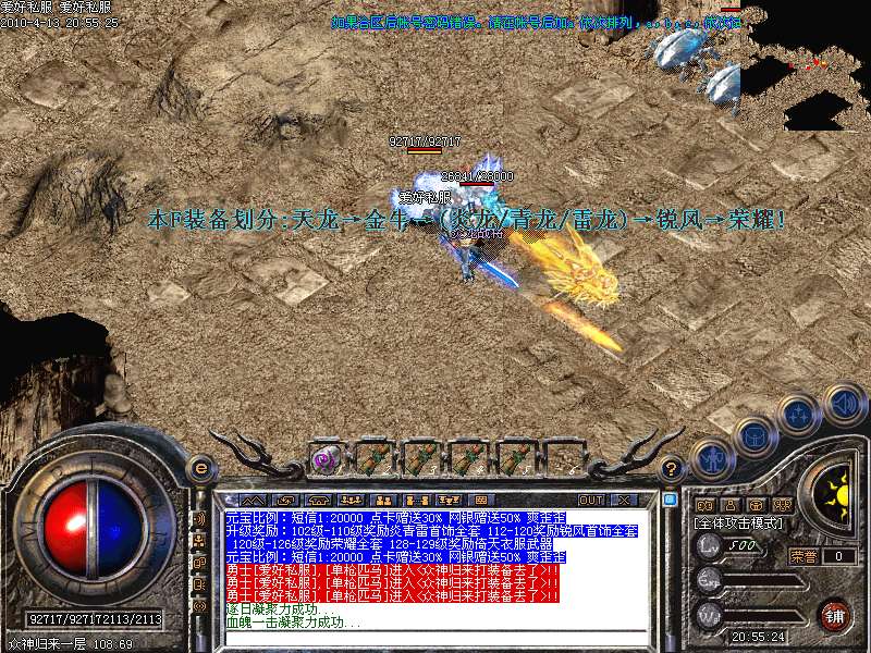 新人上线挂等级,有能力后可去雪域、 金牛乐园,元宝之地打金牛炎龙等级装备!注:超好爆