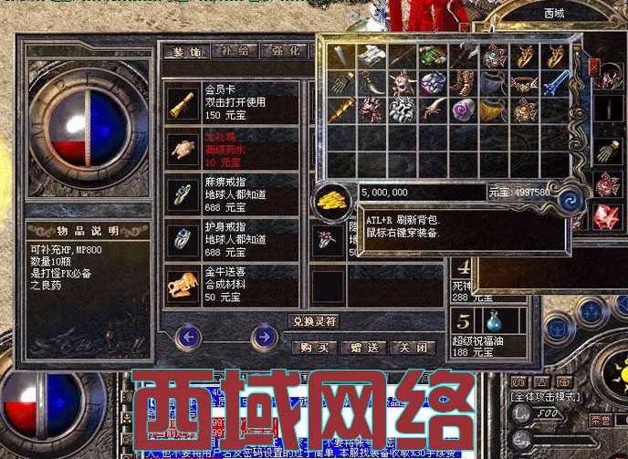 【神的恩赐系统】玩家可以在元宝商店使用获得<神的恩赐>,短暂的时间内激发自身潜能力量.增加人物死亡提示地图.坐标.方便丢了装备的快速找到该地点.