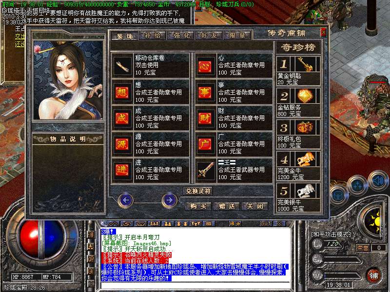 8、本服务器开黄金宝箱可获得狂雷、逆火、通云、王者系列装备。开终极礼包可获得王者以上系列装备 (是黄金宝箱的2倍)、幻神系列、麻痹、护身、复活(是黄金宝箱的6倍)