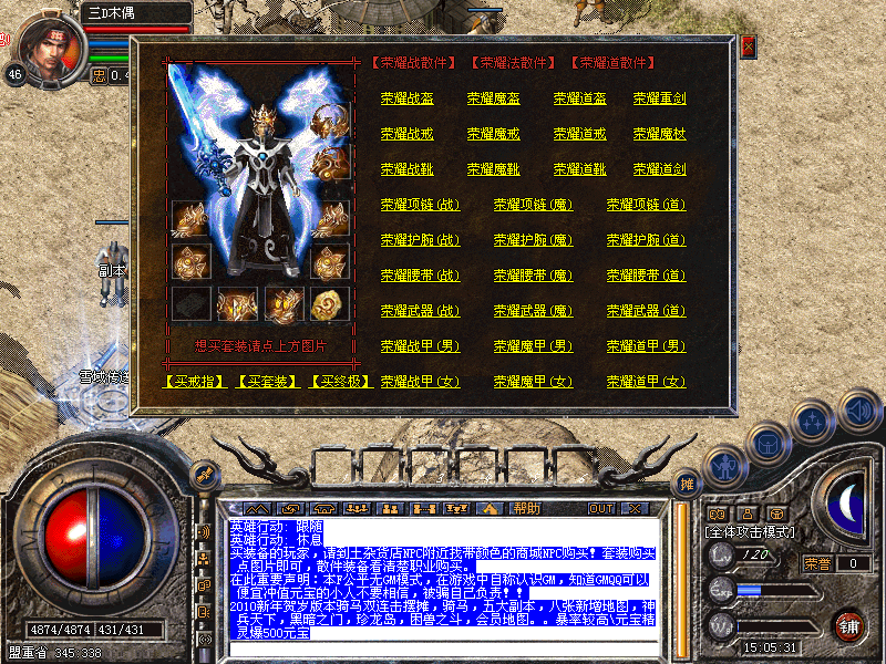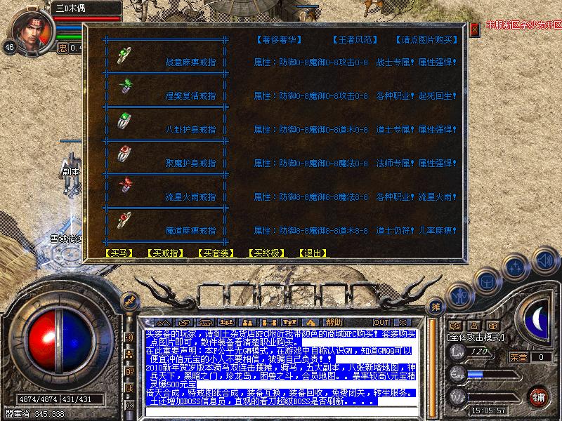 [255,56]买装备的玩家,请到土杂货店NPC附近找带颜色的商城NPC购买!套装购买点图片即可,散件装备看清楚职业购买。