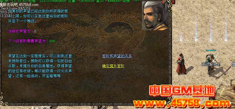 [官阶系统]:玩家可以用声望进行官阶提升.提升后将有属性增加等多功能封号系统!!!