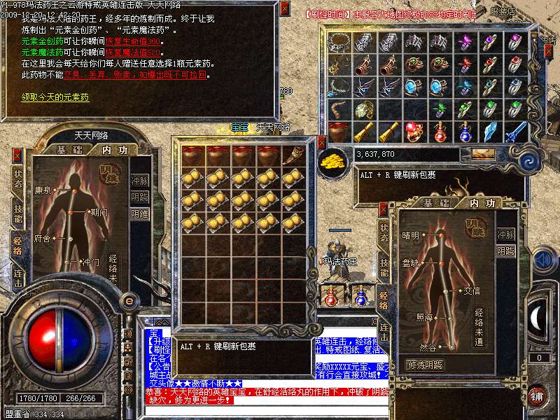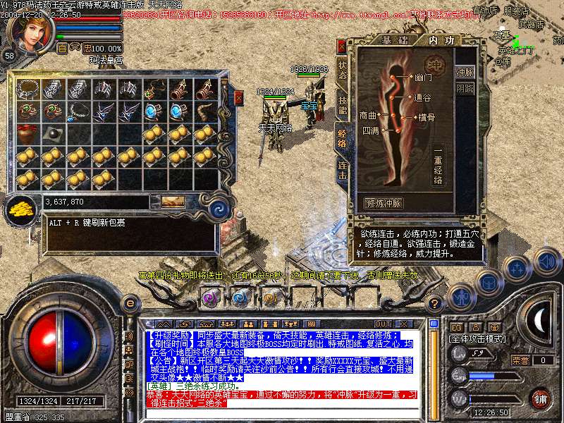 主体上线:内功技能书商店买或打怪用绿宝石找土城内功宗师换取之后修炼,连击满3级,用“舒筋活络丸”打通经络,用金针修炼经络重数;