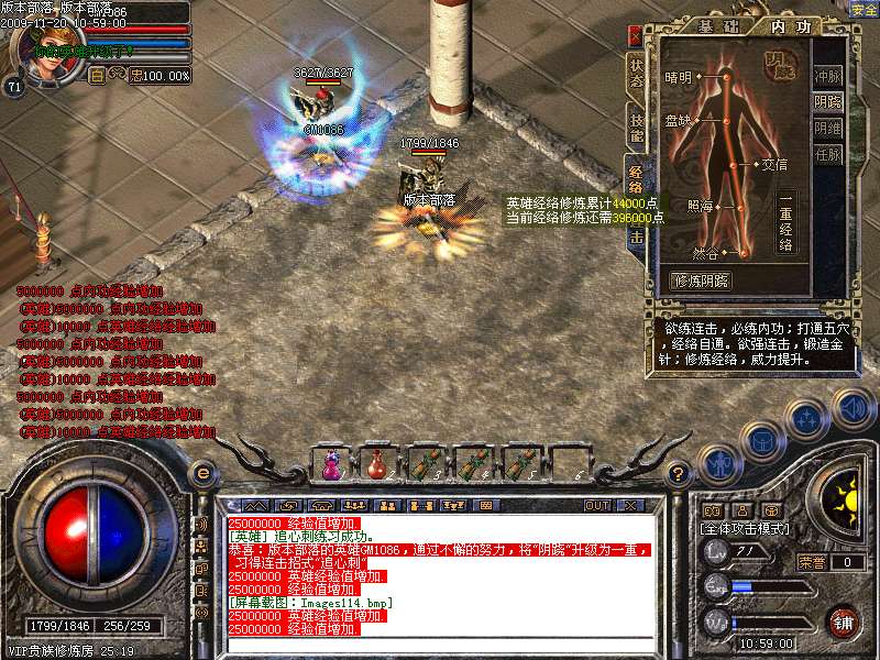 修炼英雄经络经验可以在土城【闭关修炼】进入[经验内功英雄经络三修房间]使用元宝修炼英雄经络经验