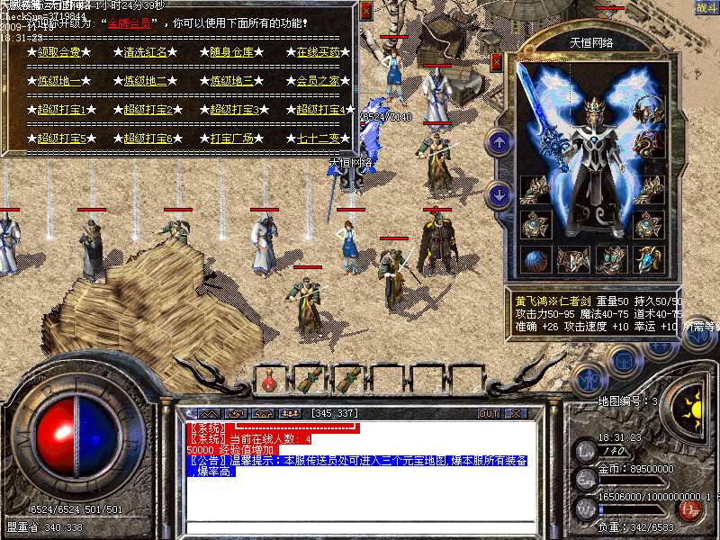 4.会员功能:上线2倍经验,随身买药,每天领取工资1000元宝和一千万金币,会员专用练级地图,专用打宝地图狂爆本服所有装备,免费洗红,在线祝福等.会员随身命令:@会员服务