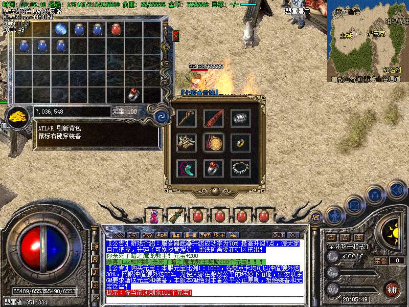 9.系统每111分钟分全服提示随机刷出一棵摇钱树,必暴出大量元宝 10.本服已添加祖玛头像爆率,爆率5/1,每月8日,18日,28日举行集体行会攻沙,届时获胜行会将获得分别为10万,20万,5万+传送戒指 (或防御,火焰戒指,可选),其余时间自行攻沙均不给予奖励,谢谢合作!