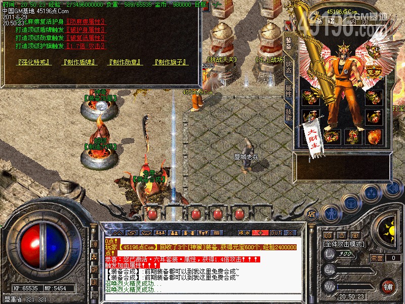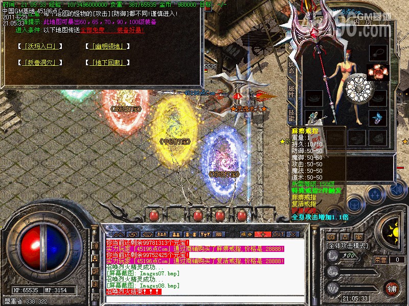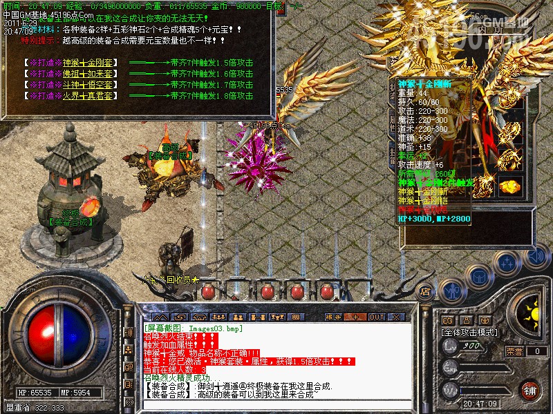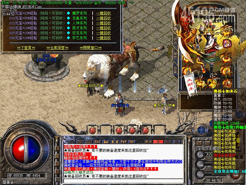 温馨提示:打到多余的装备千万别丢掉,在装备回收处可换取经验或元宝!!在装备合成处可合成高级装备!!