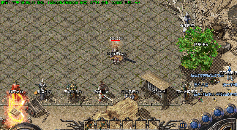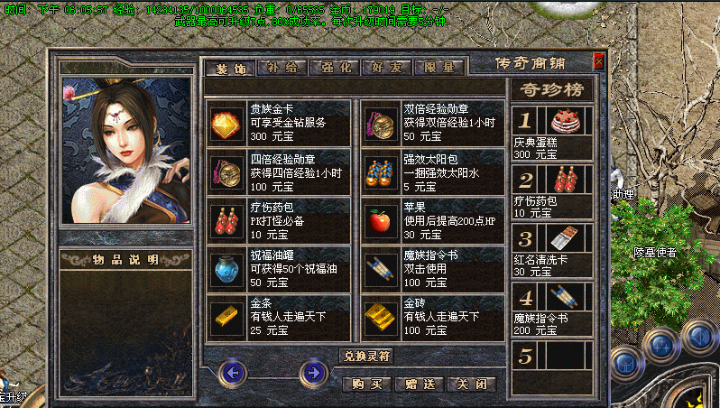 三、游戏中商城位于经验条边上的[铺]字,内可购买:三倍经验勋章、金条、传送符、祝福油……等物品以辅助玩家发展游戏;