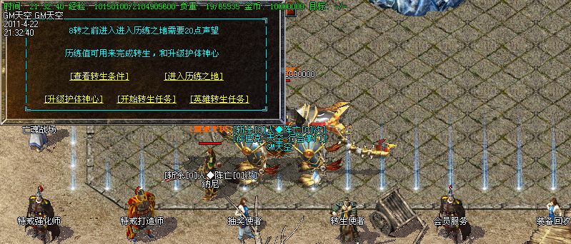 转身系统:本服的历练值可以完成转身,请到转身使者进入历练地图,杀怪获得不等的历练值.