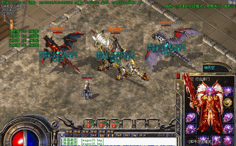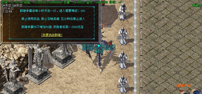 各种活动:在苍月岛,每小时会出现一只魔王,杀死魔王获得它的首级后,上交给丞相可获得1000元宝,或上古遗物一件