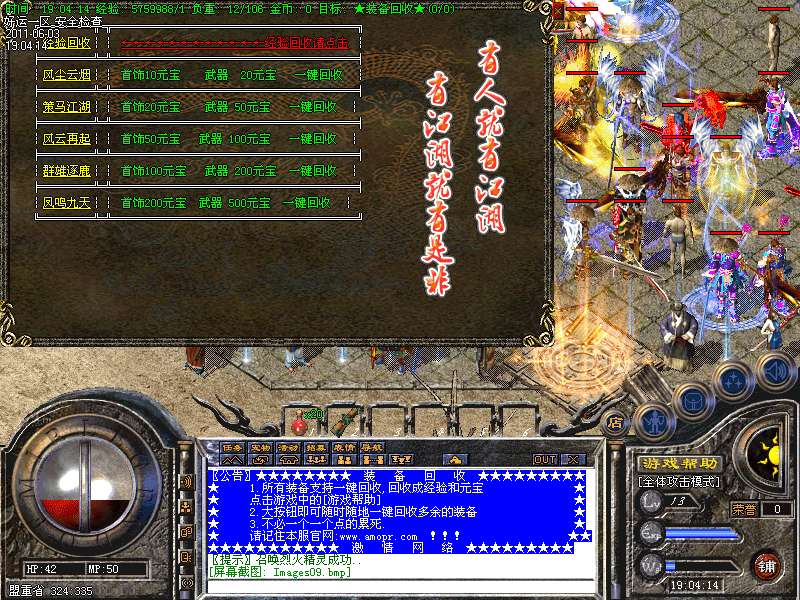 所有装备支持一键回收,回收成经验和元宝
