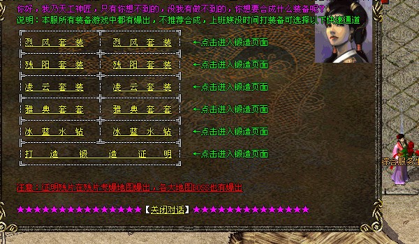 【公告】:本服务器长期稳定开放,所有装备游戏全部爆出,只要你有耐心,只要你是骨灰,一切装备不在话下。