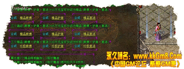 8.【自创五转技能:葵花宝典,护体神盾,九阳神功,麻痹宝宝,转生后最高获得1.3倍攻击,但无属性,必须完成本服独创转生任务,方可获得属性点!】