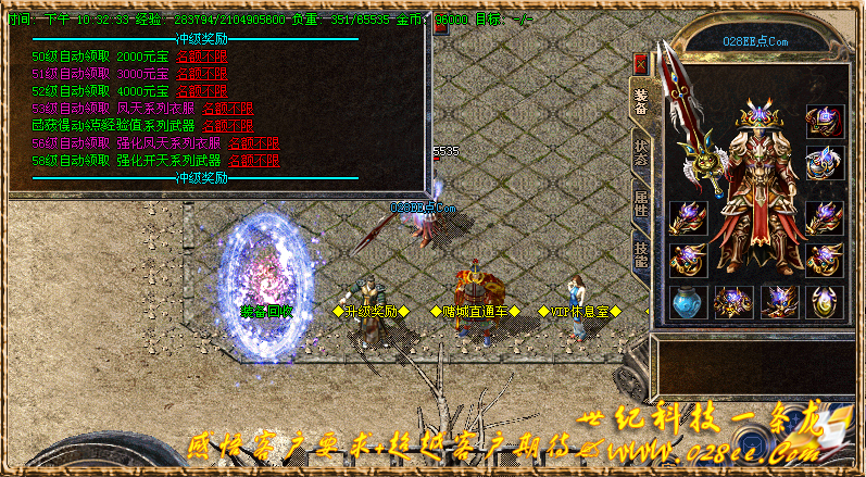 【装备奖励】:53领凤天魔甲.54领开天.55领取勋章和宝石 56领取终极武器+衣服