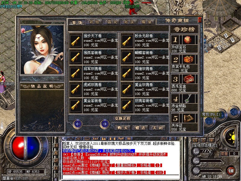 【经验升级】:喜欢升级的朋友可以进入贵宾房间刷经验怪,带上多倍经验勋章升的很快!元宝商店《神的恩赐》第八重可以用元宝开启10倍经验!