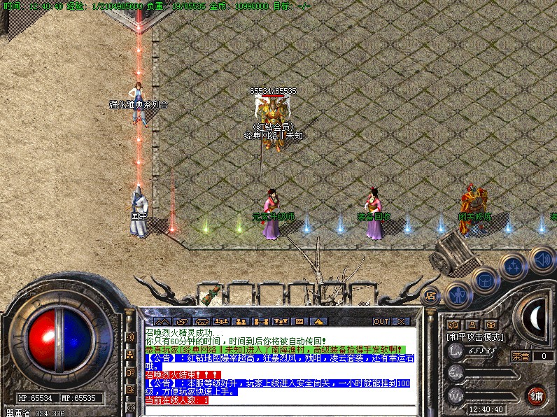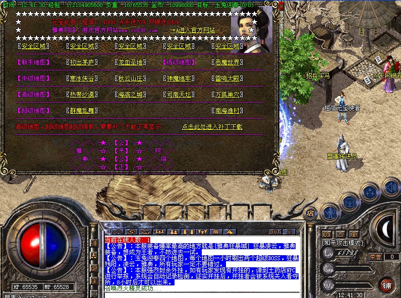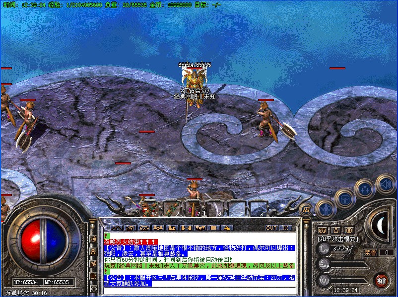 【公告】:行会战场两小时举行一次,可以进去半个小时,每30秒增加100点荣誉值和300万经验,荣誉值可以直接换元宝。