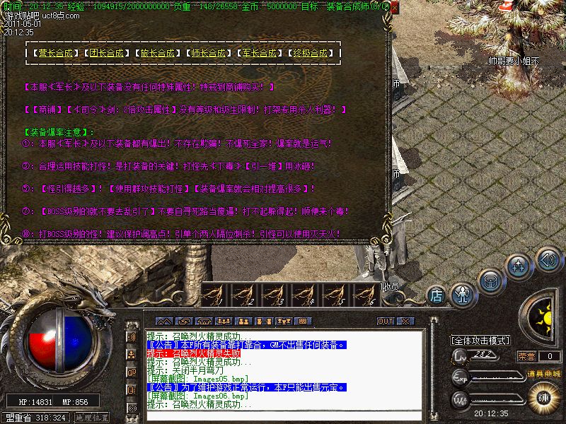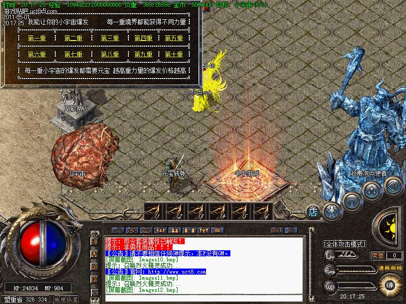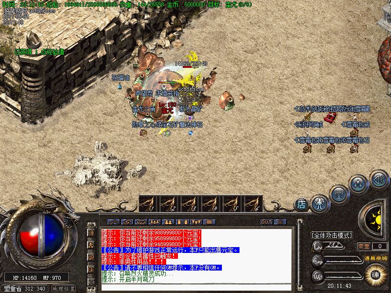 【元宝回馈】休息间每半个小时刷一只元宝怪!会爆出大量财富!是玩家必争之地!并且元宝怪死的地点人物站上可每秒产生1000W经验,真 是太疯狂了.