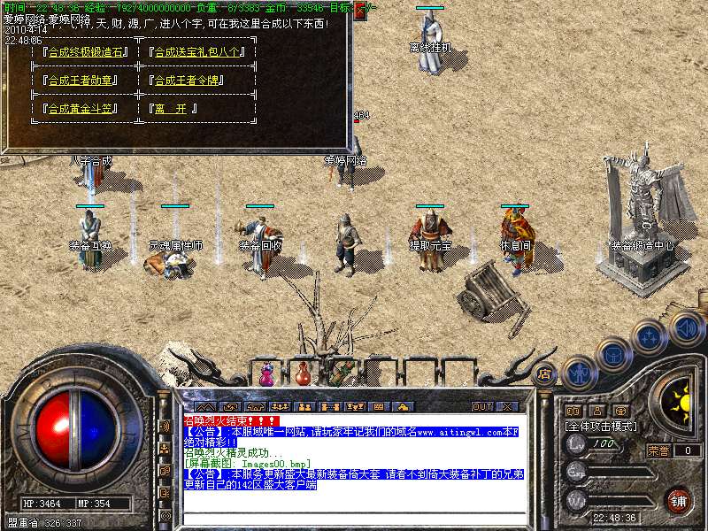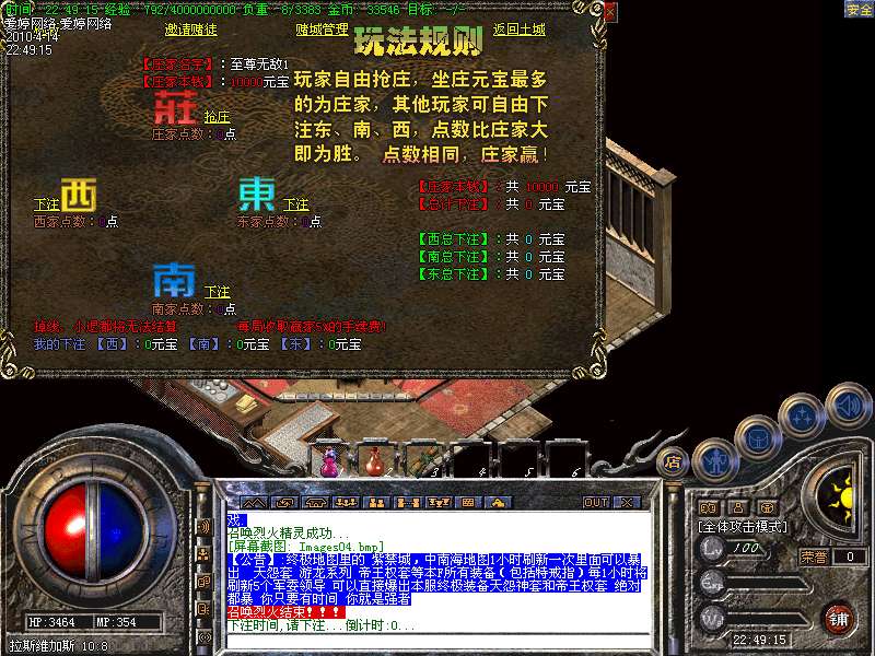 游戏特色:本服游戏里面有超完美的东南西北赌博系统. 玩家还可以根据自己的在线时间,免费领取相对的元宝.设计完全参照非RMB玩家的需求.. 游戏里还有 万能格 NPC 是考验您智商的地方. 四十个问题.您敢回答么? 有钱是爷, 那么, 没钱就杀爷吧.