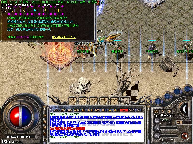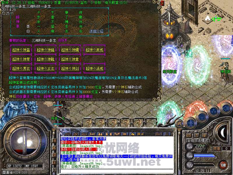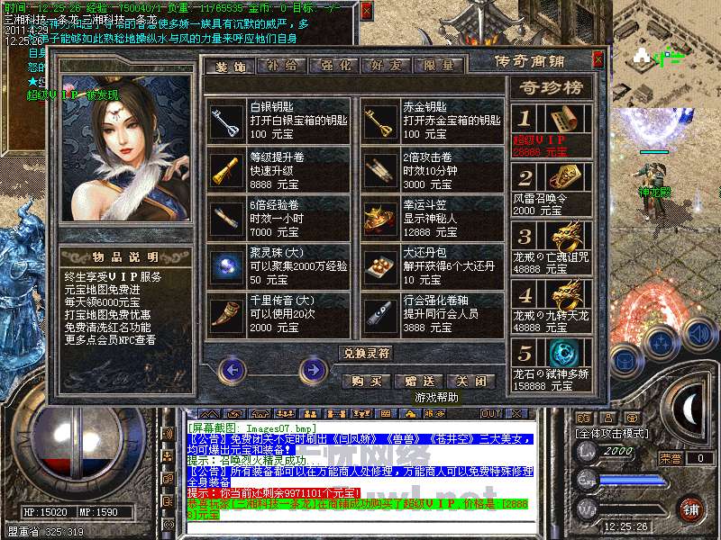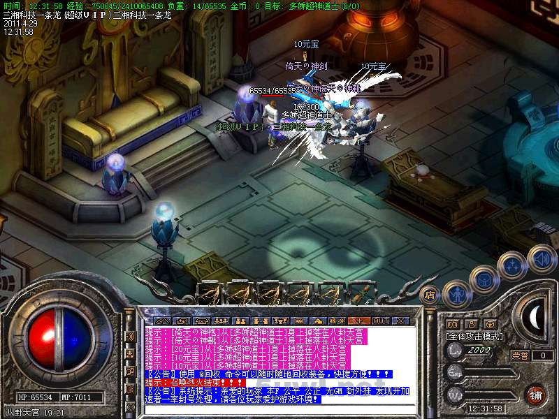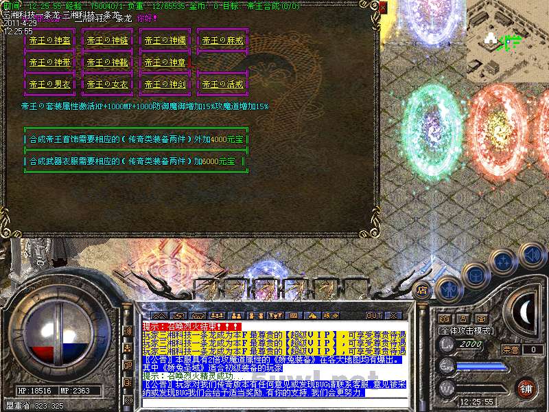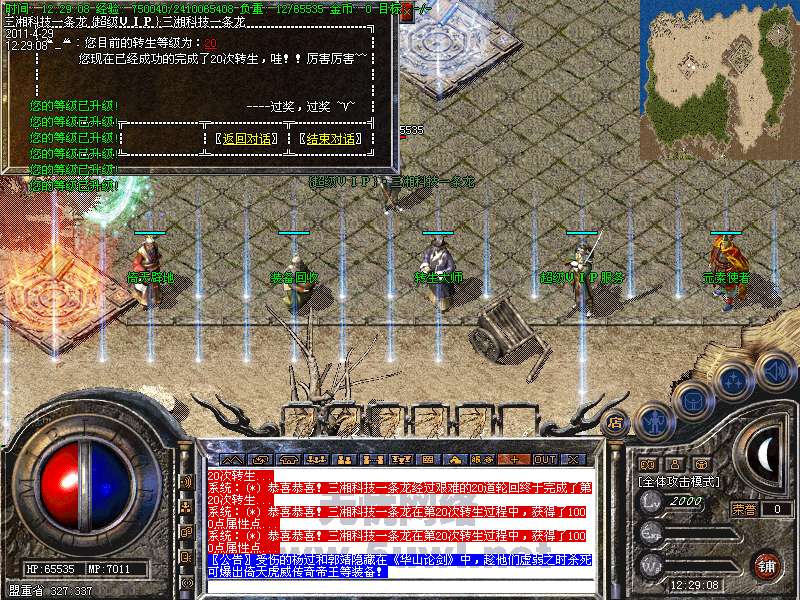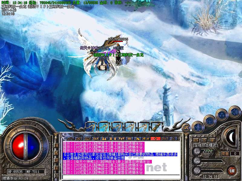 功能:升级系统、闭关修炼、装备合成系统、五行系统、转身系统、超级VIP、行会战场等。