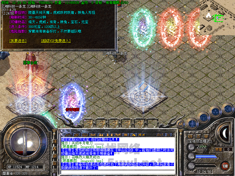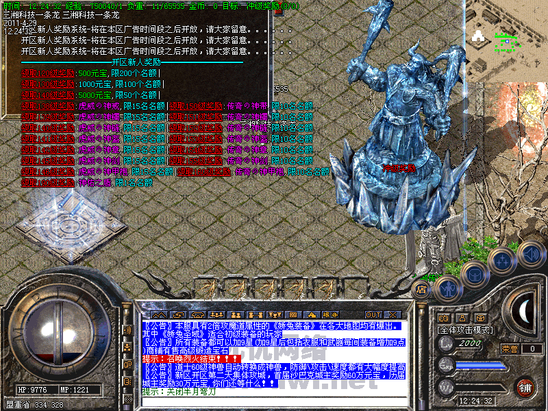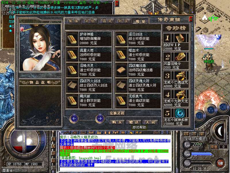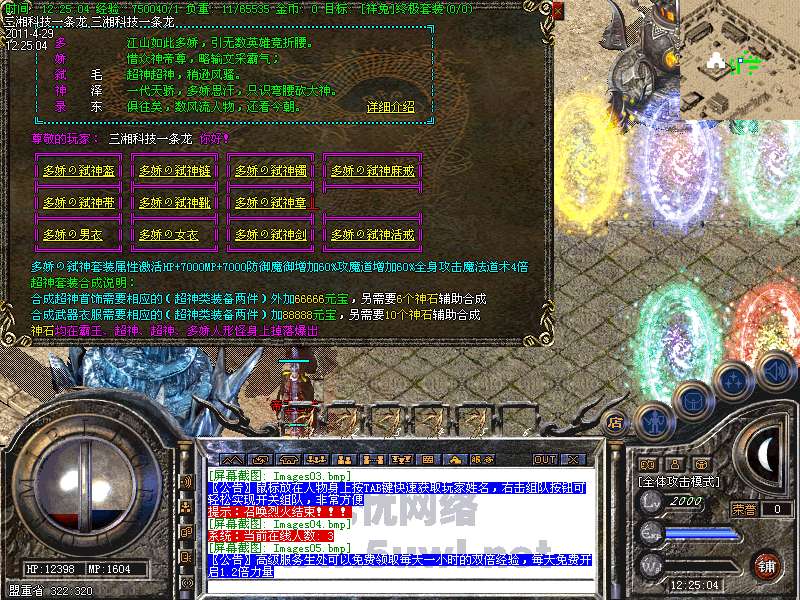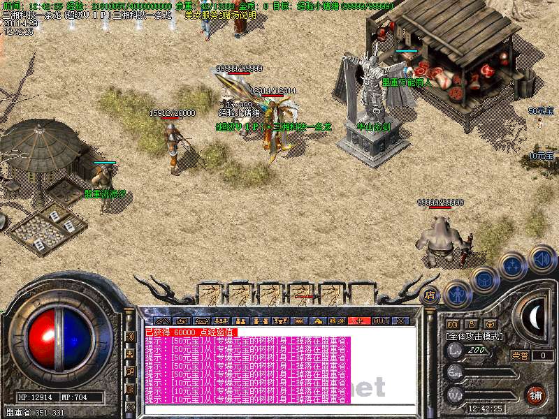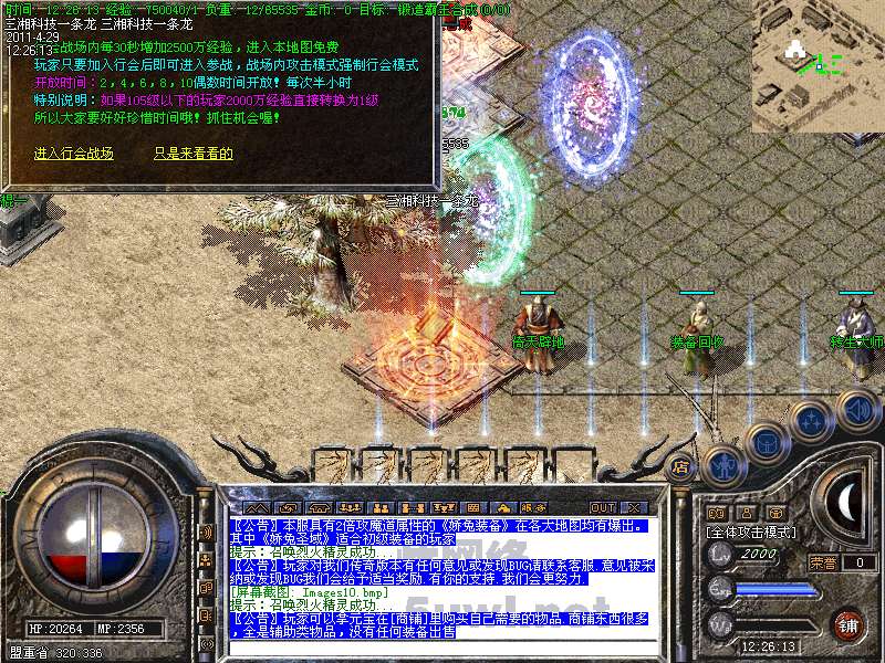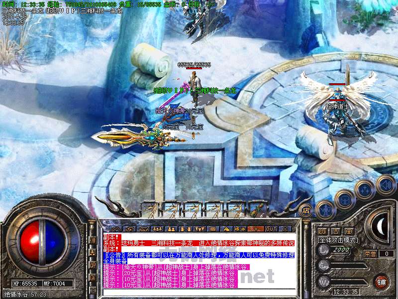 功能:升级系统、闭关修炼、装备合成系统、五行系统、转身系统、超级VIP、行会战场等。