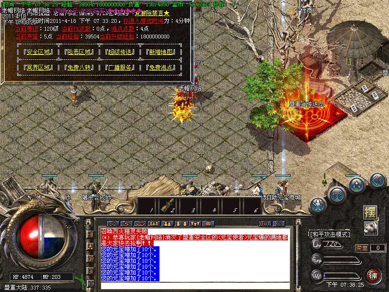 盟重土城设有经验猪`可免费获得经验`有赤金树`可免费获得元宝及宝箱`定时刷元宝大怪`打死可获得超多元宝`