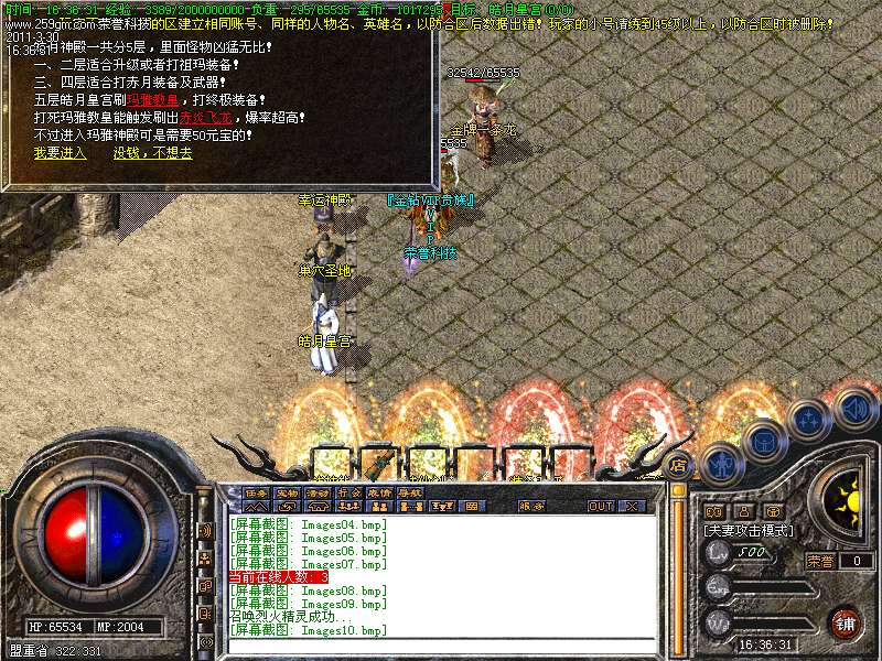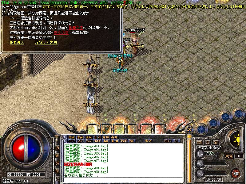 9、地狱之门:本服特色,花100元宝进去,一共80层,每层有怪,通过掷骰子决定你前面的房间数(不退回)。越后面怪物等级越高,70层开始层层大BOSS!不要觉得100元宝贵,在里面随便打几个BOSS拿几件赤月回收下就有了,如果遇到元宝精灵那就更好了!最后提醒下各位玩家,每逢个位是4的层数都比较危险!