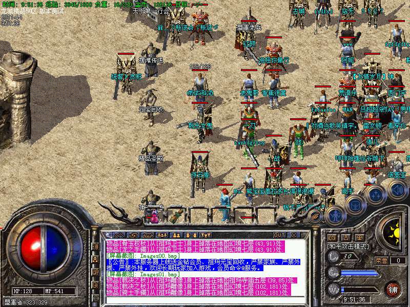 <255,252>〖提示〗:本服务器为长期服,拒绝家族形式玩家,禁止外援,40级以下禁止攻城!为避免被删号,家族玩家请绕行,谢谢合作!晚9点到10点之间,藏宝阁沙巴克秘史可以传送进入皇宫!