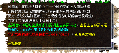 [244] 为了提高游戏活跃气氛,服务器将每天晚上18:00在封魔谷进行怪物攻城活动,请各位勇士把握好时间,运气好就可以打到终极装备喔!