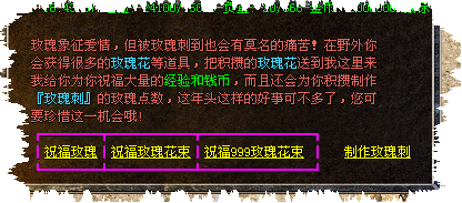 [243] 在野外升级您会获得:玫瑰,玫瑰花束和999朵玫瑰花束等道具。这三样道具是制作毒素武器【玫瑰刺】的主要原料。获得此三样道具在土城的玫瑰使者处可以兑换大量经验和金钱的奖励。真可谓一举多得啊!
