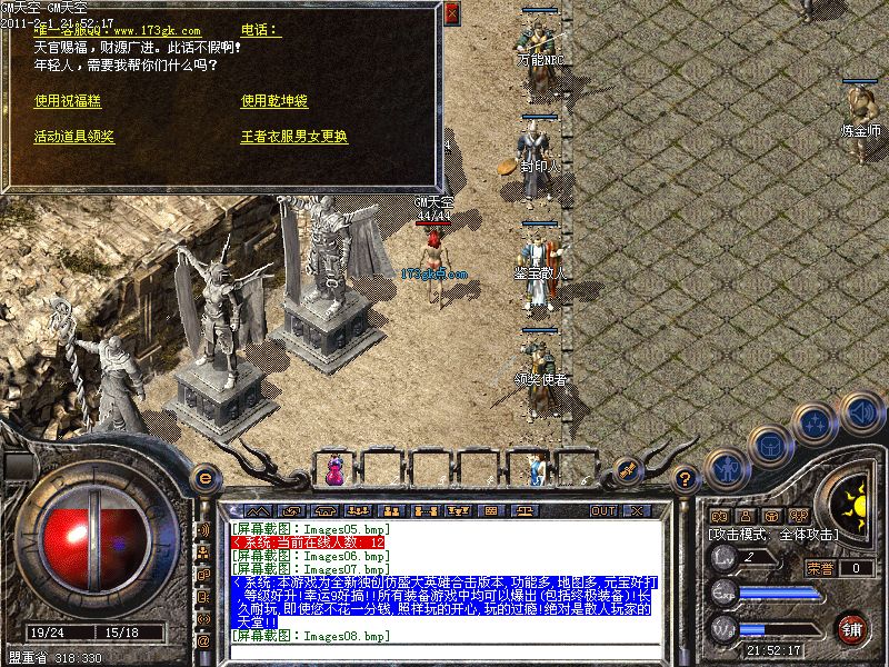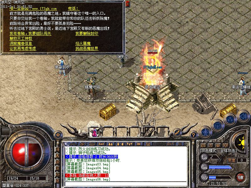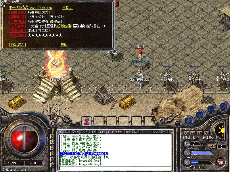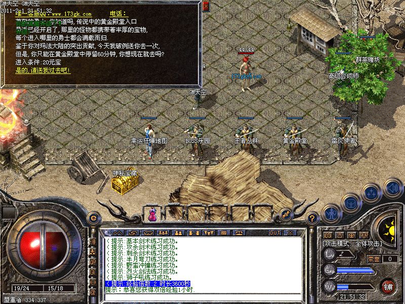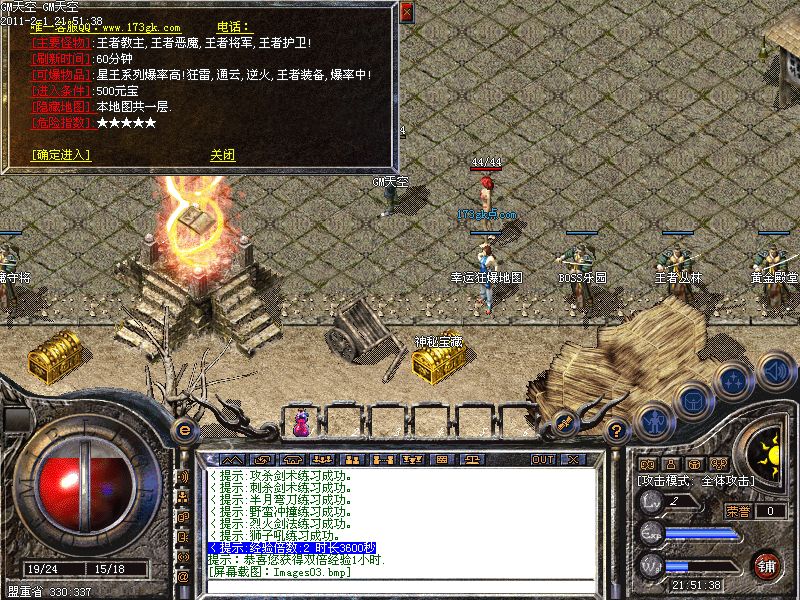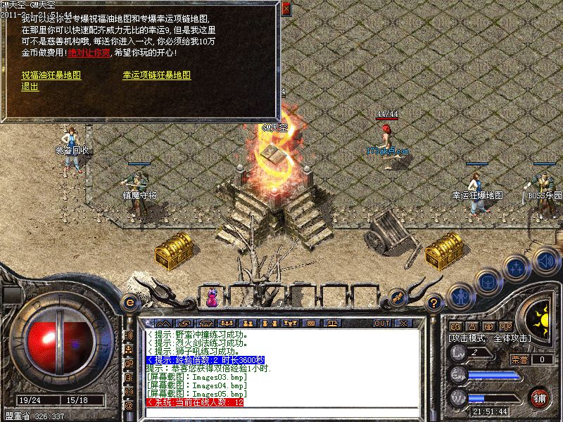 各种宝箱都可以开出超高经验及顶级装备!为考虑战士和道士玩家练级难的问题!特在盟重卧龙笔记旁放置神秘宝藏,可以开出大量经验!战士道士升级不再是难题!!